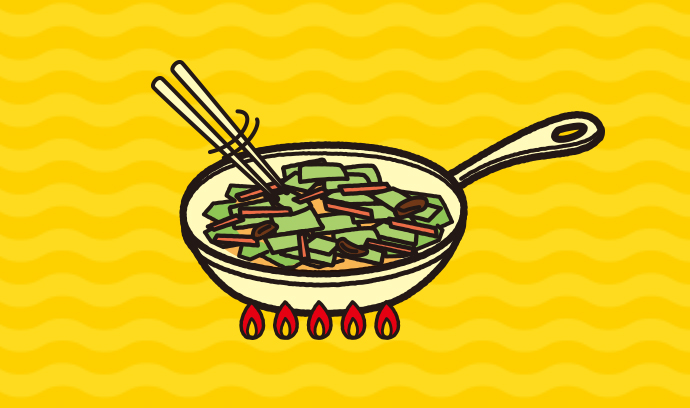 火を弱めて、鍋肌につかないように粉末ソースを加えてよく混ぜる合わせる。最後に火を中火に戻して軽く炒める。